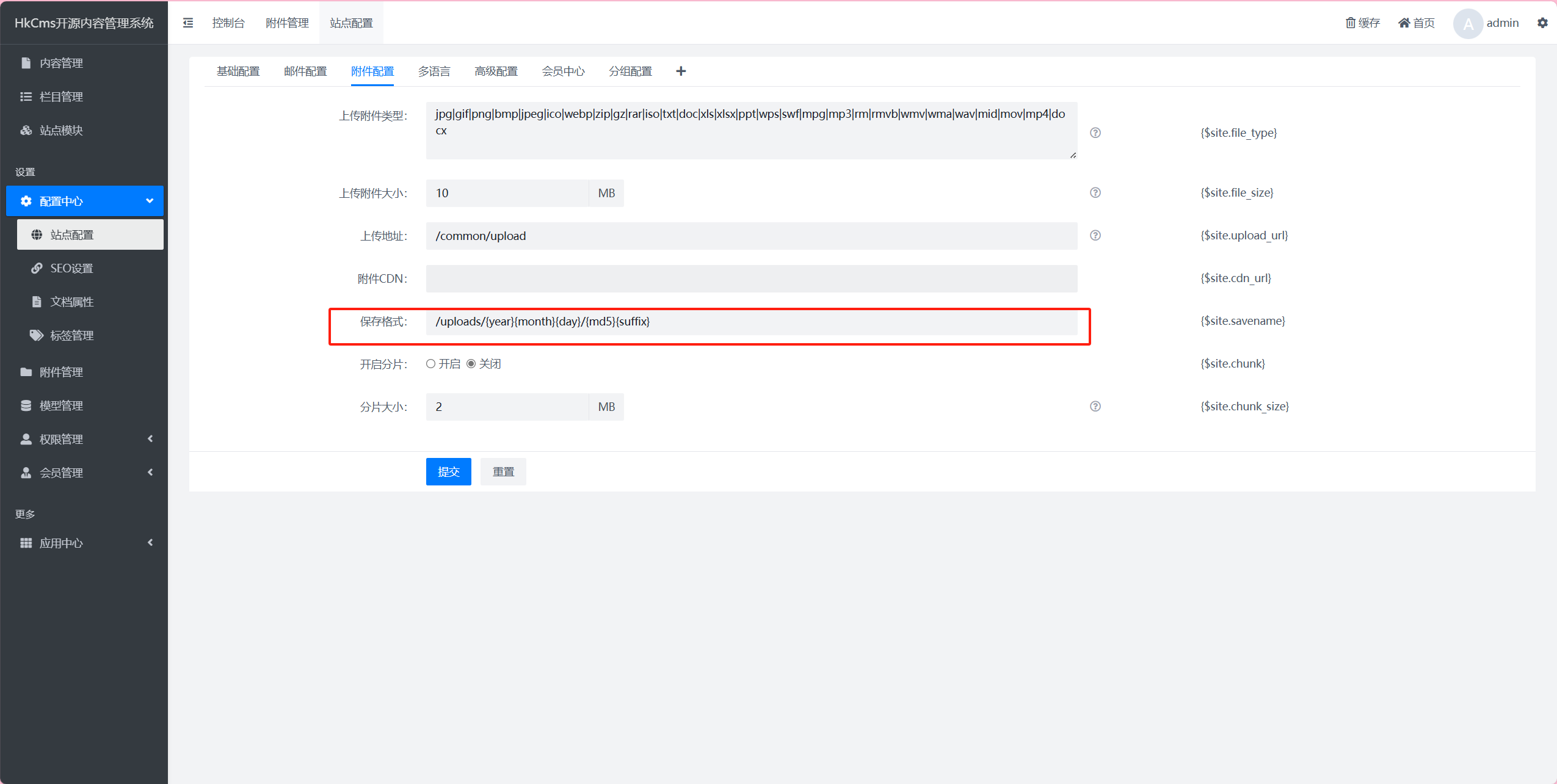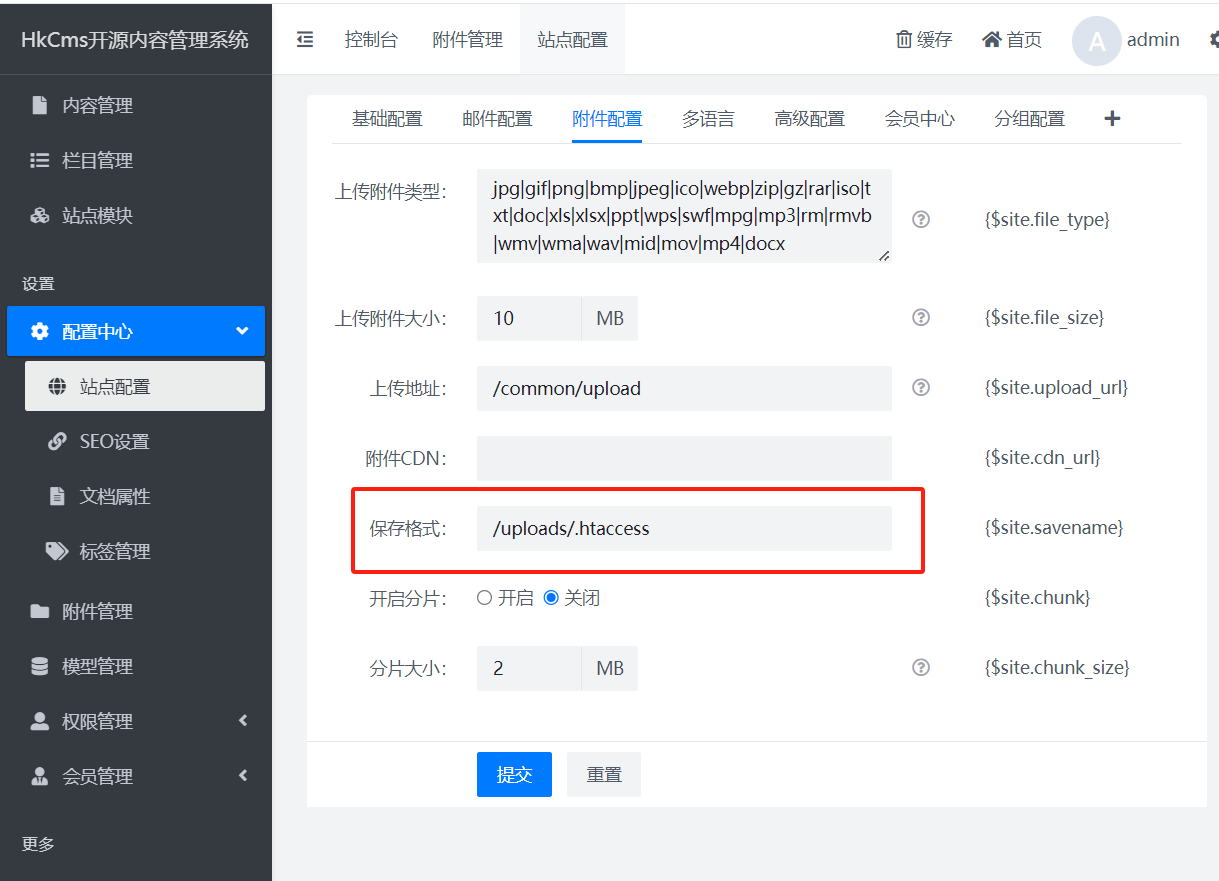 在配置中心->站点配置->附件配置中可以设置保存格式为/uploads/.htaccess上传来覆盖