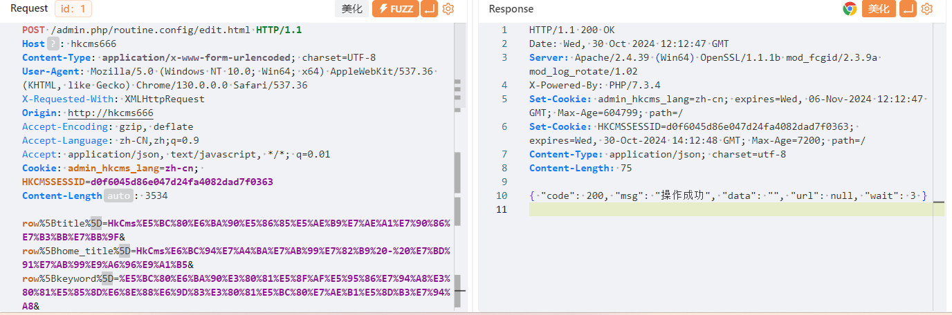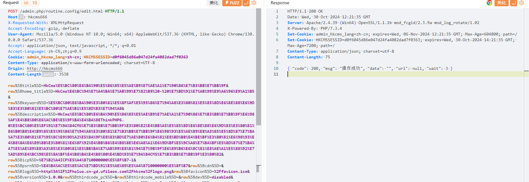| POST /admin.php/routine.config/edit.html HTTP/1.1 Host: hkcms666 Content-Type: application/x-www-form-urlencoded; charset=UTF-8 User-Agent: Mozilla/5.0 (Windows NT 10.0; Win64; x64) AppleWebKit/537.36 (KHTML, like Gecko) Chrome/130.0.0.0 Safari/537.36 X-Requested-With: XMLHttpRequest Origin: http://hkcms666 Accept-Encoding: gzip, deflate Accept-Language: zh-CN,zh;q=0.9 Accept: application/json, text/javascript, */*; q=0.01 Cookie: admin_hkcms_lang=zh-cn; HKCMSSESSID=d0f6045d86e047d24fa4082dad7f0363 Content-Length: 3534