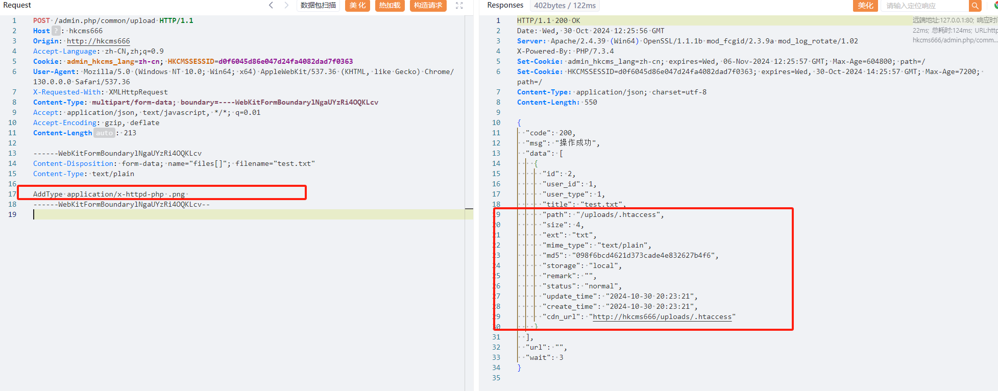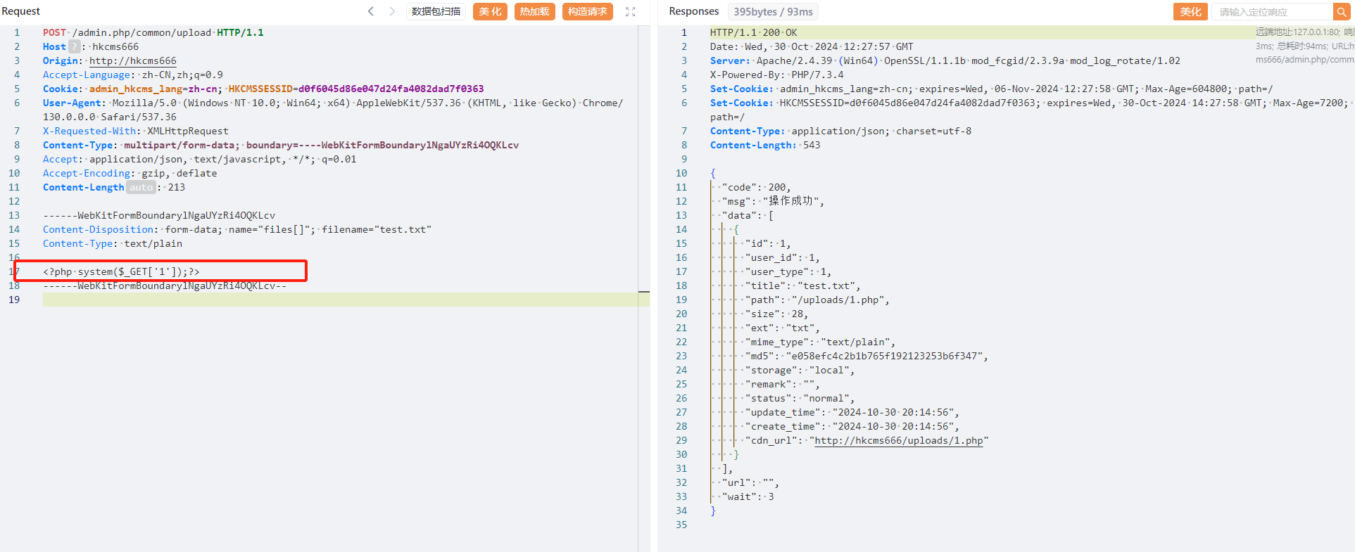 | POST /admin.php/common/upload HTTP/1.1 Host: hkcms666 Origin: http://hkcms666 Accept-Language: zh-CN,zh;q=0.9 Cookie: admin_hkcms_lang=zh-cn; HKCMSSESSID=d0f6045d86e047d24fa4082dad7f0363 User-Agent: Mozilla/5.0 (Windows NT 10.0; Win64; x64) AppleWebKit/537.36 (KHTML, like Gecko) Chrome/130.0.0.0 Safari/537.36 X-Requested-With: XMLHttpRequest Content-Type: multipart/form-data; boundary=----WebKitFormBoundarylNgaUYzRi4OQKLcv Accept: application/json, text/javascript, */*; q=0.01 Accept-Encoding: gzip, deflate Content-Length: 213