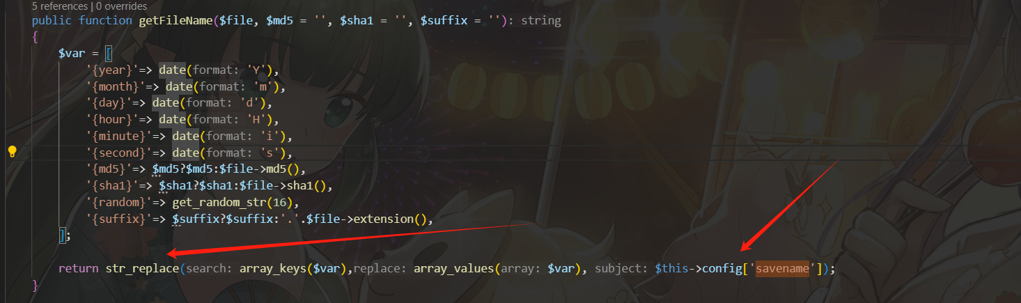 在getFileName方法中用str_replace函数来替换config中的占位符,然而如果在后台把config篡改,没有了占位符匹配,所以替换不生效,并且该方法没有经过后缀检验,所以可以上传任意文件