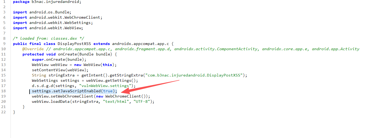 跟进到com.b3nac.injuredandroid.DisplayPostXSS