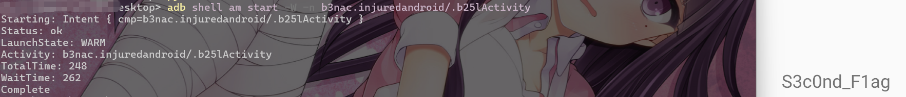 | adb shell am start -W -n b3nac.injuredandroid/.b25lActivity