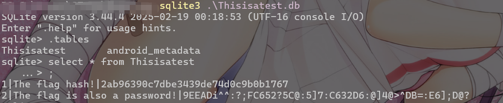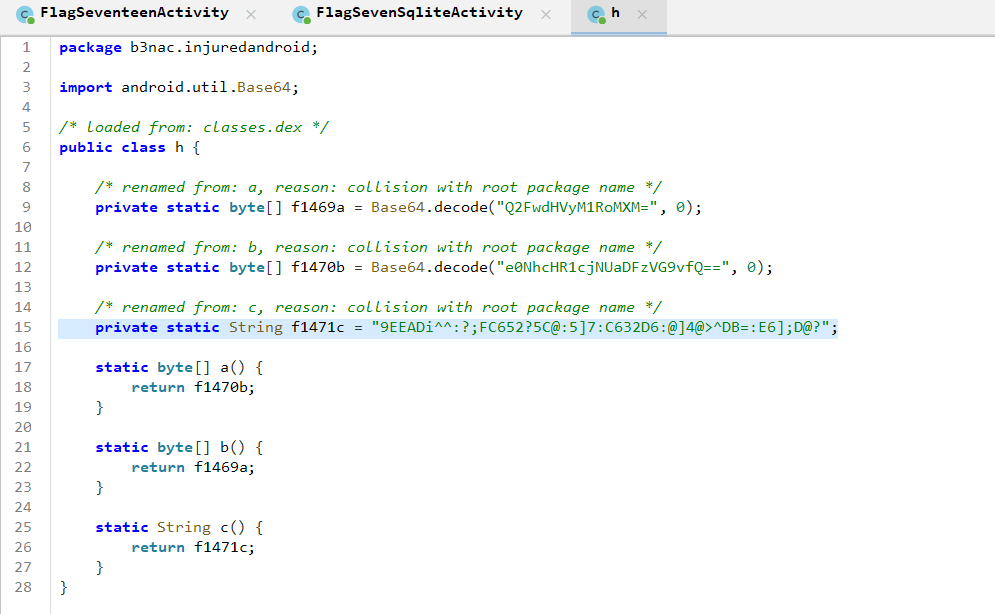 | contentValues.put("title", Base64.decode("VGhlIGZsYWcgaGFzaCE=", 0)); contentValues.put("subtitle", Base64.decode("MmFiOTYzOTBjN2RiZTM0MzlkZTc0ZDBjOWIwYjE3Njc=", 0)); writableDatabase.insert("Thisisatest", null, contentValues); contentValues.put("title", Base64.decode("VGhlIGZsYWcgaXMgYWxzbyBhIHBhc3N3b3JkIQ==", 0)); contentValues.put("subtitle", h.c());
