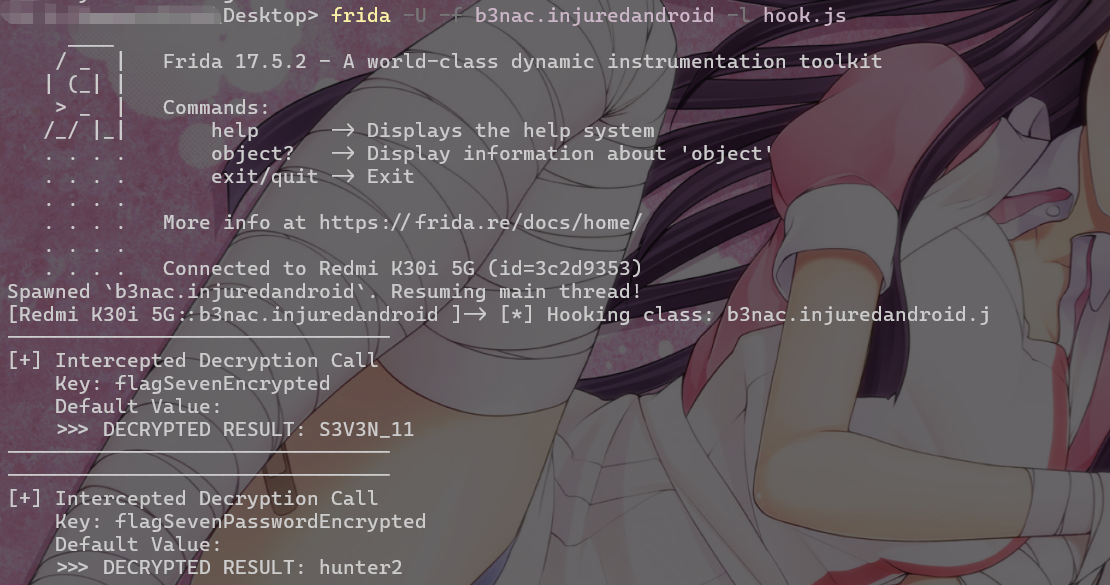 // 打印日志 console.log("--------------------------------"); console.log("[+] Intercepted Decryption Call"); console.log(" Key: " + key); console.log(" Default Value: " + defaultValue); console.log(" >>> DECRYPTED RESULT: " + result); console.log("--------------------------------");