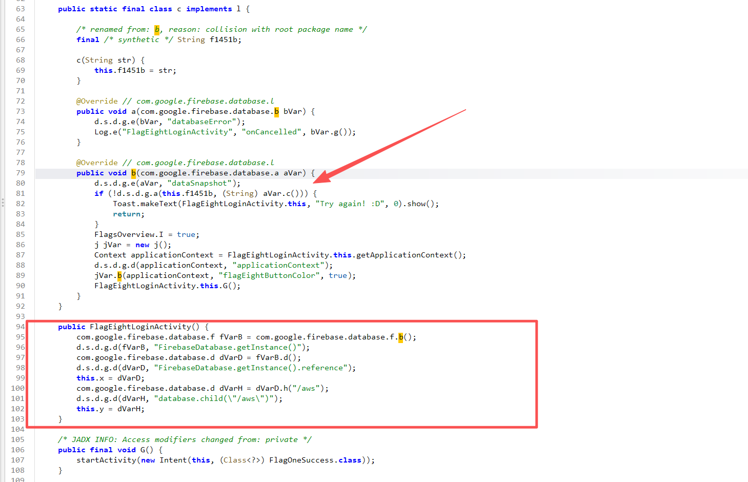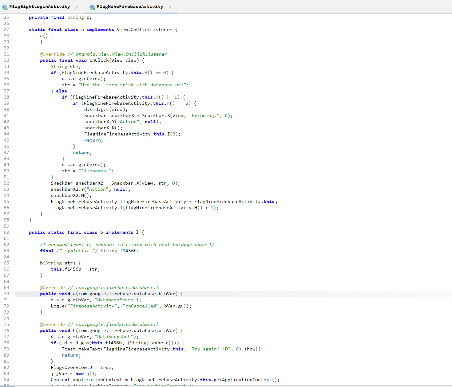 | public void b(com.google.firebase.database.a aVar) { FlagTenUnicodeActivity flagTenUnicodeActivity; String str; d.s.d.g.e(aVar, "dataSnapshot"); String str2 = (String) aVar.c(); if (d.s.d.g.a(this.f1462b, str2)) { //如果输入与firebase获取的相等 flagTenUnicodeActivity = FlagTenUnicodeActivity.this; str = "No cheating. :]"; } else { String str3 = this.f1462b; Locale locale = Locale.ROOT; d.s.d.g.d(locale, "Locale.ROOT"); if (str3 == null) { throw new NullPointerException("null cannot be cast to non-null type java.lang.String"); } String upperCase = str3.toUpperCase(locale); //输入转为大写 d.s.d.g.d(upperCase, "(this as java.lang.String).toUpperCase(locale)"); d.s.d.g.c(str2); Locale locale2 = Locale.ROOT; d.s.d.g.d(locale2, "Locale.ROOT"); if (str2 == null) { throw new NullPointerException("null cannot be cast to non-null type java.lang.String"); } String upperCase2 = str2.toUpperCase(locale2); //firebase获取数据转为大写 d.s.d.g.d(upperCase2, "(this as java.lang.String).toUpperCase(locale)"); if (d.s.d.g.a(upperCase, upperCase2)) { //转为大写后再比较 FlagTenUnicodeActivity.this.G(); //需要相等 return; } else { flagTenUnicodeActivity = FlagTenUnicodeActivity.this; str = "Try again! :D"; } } Toast.makeText(flagTenUnicodeActivity, str, 0).show(); }