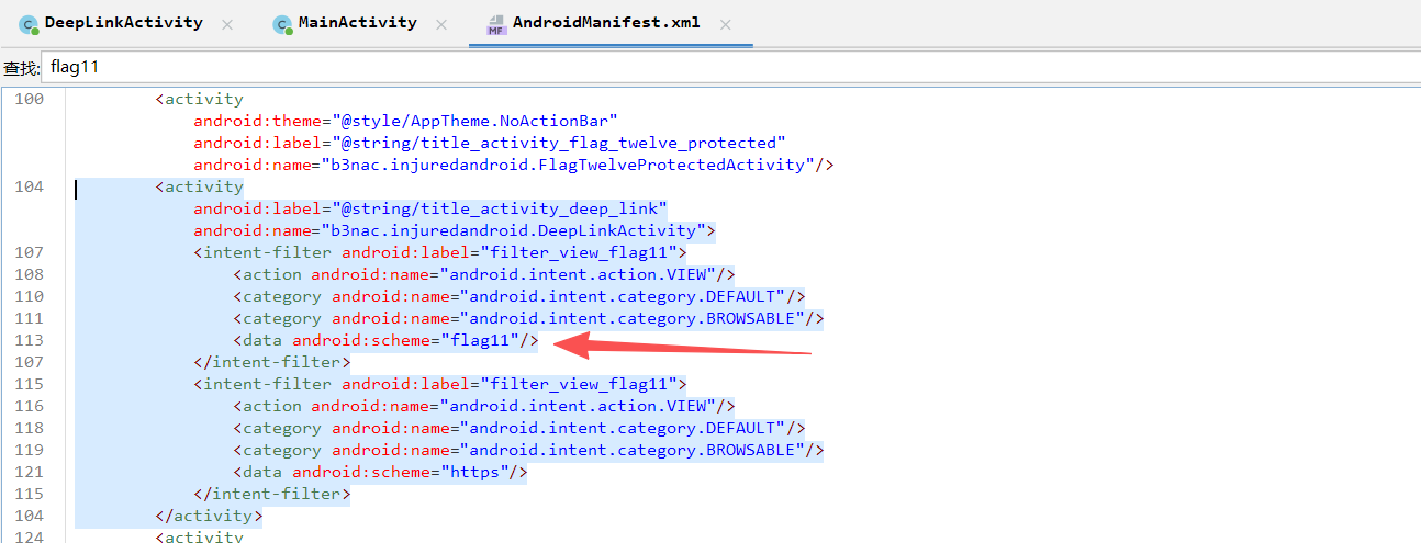 在AndroidManifest.xml能找到deeplink的配置,通过url scheme方式,访问flag11://能跳转到当前应用的DeepLinkActivity页面