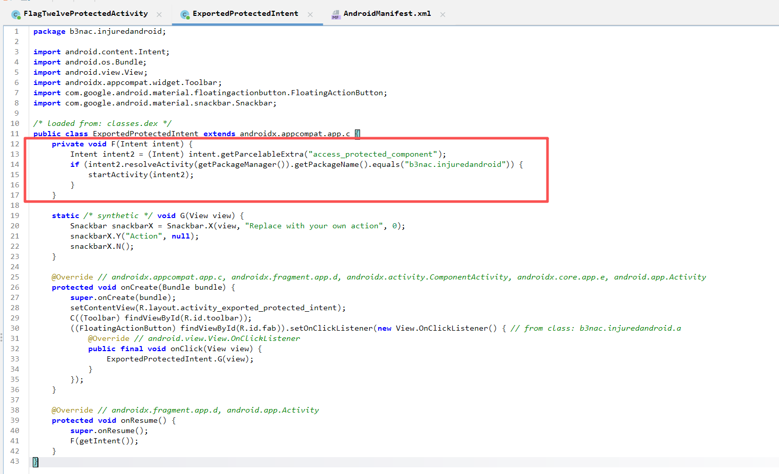 所以可以通过b3nac.injuredandroid.ExportedProtectedIntent.f()来触发b3nac.injuredandroid.FlagTwelveProtectedActivity,这就是 Intent 重定向漏洞。