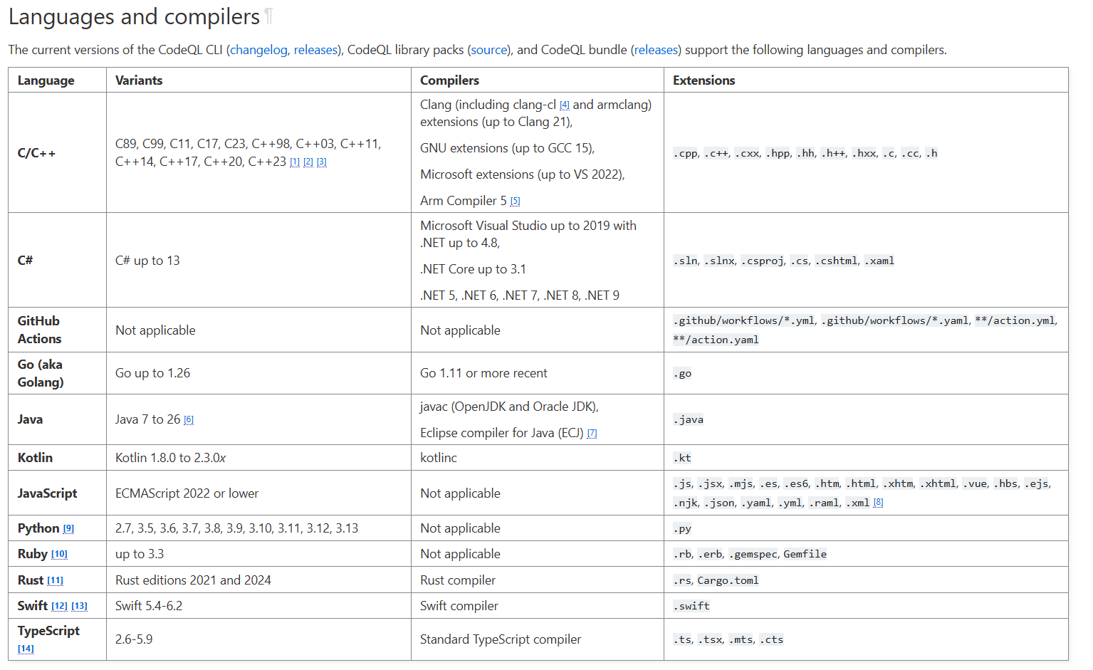 支持的语言和框架:https://codeql.github.com/docs/codeql-overview/supported-languages-and-frameworks/