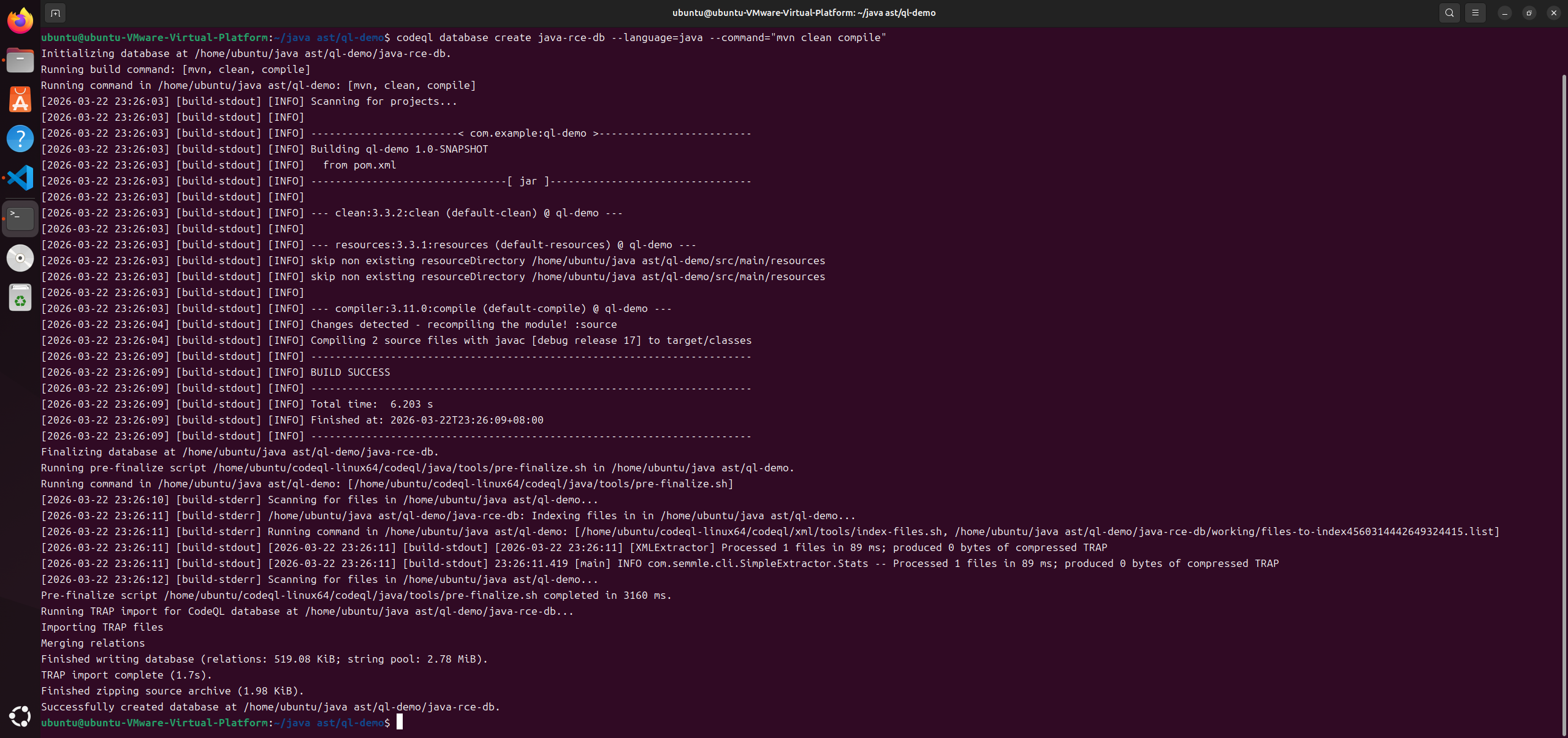 | codeql database create java-rce-db --language=java --command="mvn clean compile"