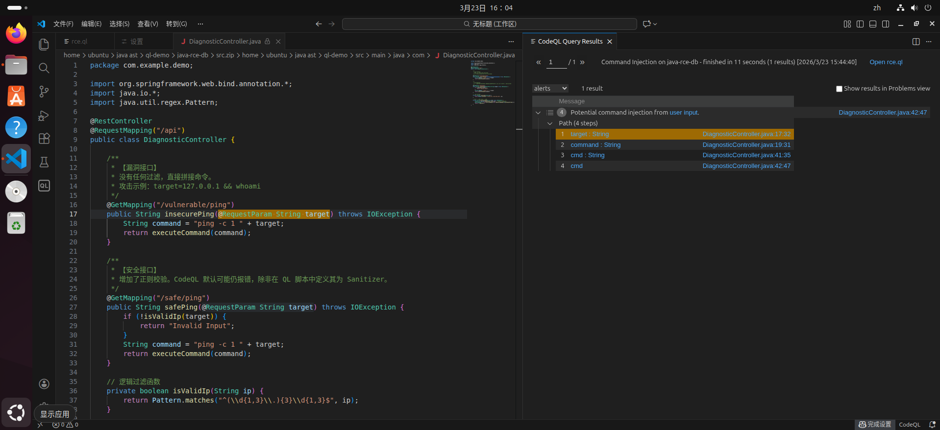 /** * 【安全接口】 * 增加了正则校验。CodeQL 默认可能仍报错,除非在 QL 脚本中定义其为 Sanitizer。 */ @GetMapping("/safe/ping") public String safePing(@RequestParam String target) throws IOException { if (!isValidIp(target)) { return "Invalid Input"; } String command = "ping -c 1 " + target; return executeCommand(command); }